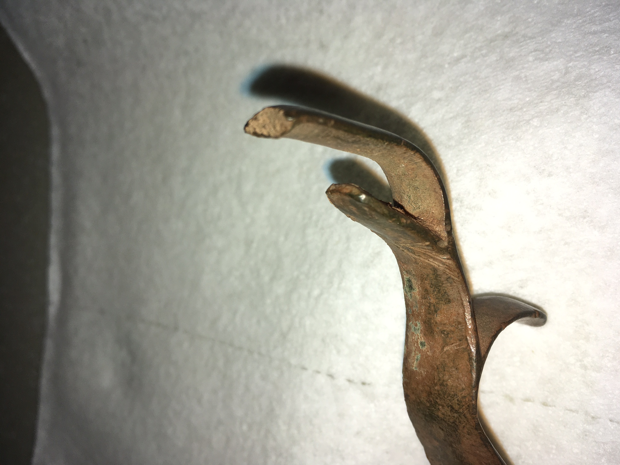 I found the piece of metal buried about 3" deep in the soil. I first took it for an old cabinet pull or some piece of junk but after staring at it for a bit I couldn't help but think it might possibly a part to an old firearm.