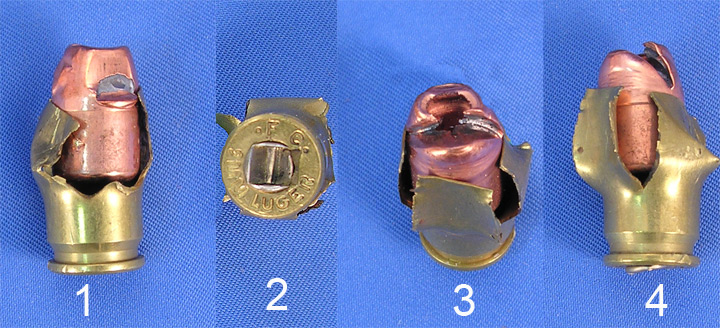 When we retrieved and examined the pistol we realized that the remains of the detonated round were still in the ejection port. It was apparent that the round had nosedived into the feed ramp and that in doing so it literally positioned the primer exactly over the extractor. When the shooter slammed the slide forward with his left hand the extractor crushed the primer causing the 9mm round to detonate. If you look at photo #1 you can get an idea of the quantity of brass fragments that struck the shooter’s hand. In photo #2 you can see where the extractor crushed the primer (pistol was a Kahr 9mm). This particular gentleman is very forceful when he manipulates his pistol. Photo #3 show where the force of the detonation forced the bullet into the feed ramp. Photo #4 provides another view.