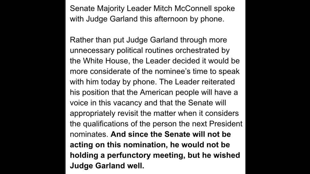 McConnell spoke to Garland by phone today. He won't meet with him. Readout via McConnell's office: see https://twitter.com/sahilkapur/status/7 ... 2330080257