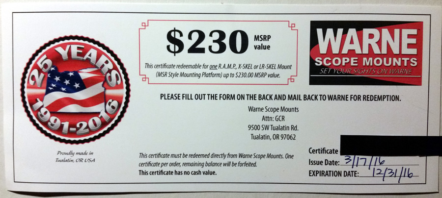 Certificate good for Warne RAMP, X-SKEL or LR-SKEL mount up to a $230 msrp value.