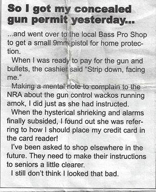 TSA agent tells the guy "I need to check your waistband".... and the guy opens his belt and drops his pants to about mid-thigh before the TSA lady could stop him. "NOOOO NoOooooooooOooo.... That's not what I meant!!". The guys wife was cracking up. I bit my lip until we were clear of the area and my kid said "nice boxers on that dude".
