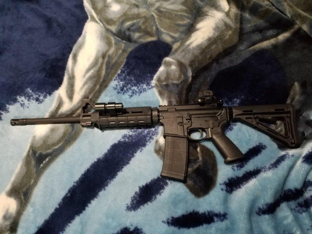 Ruger AR-556 with Black Magpul MOE furniture and upgraded rear iron sight. It also has a cheap BSA flashlight mounted to it.
