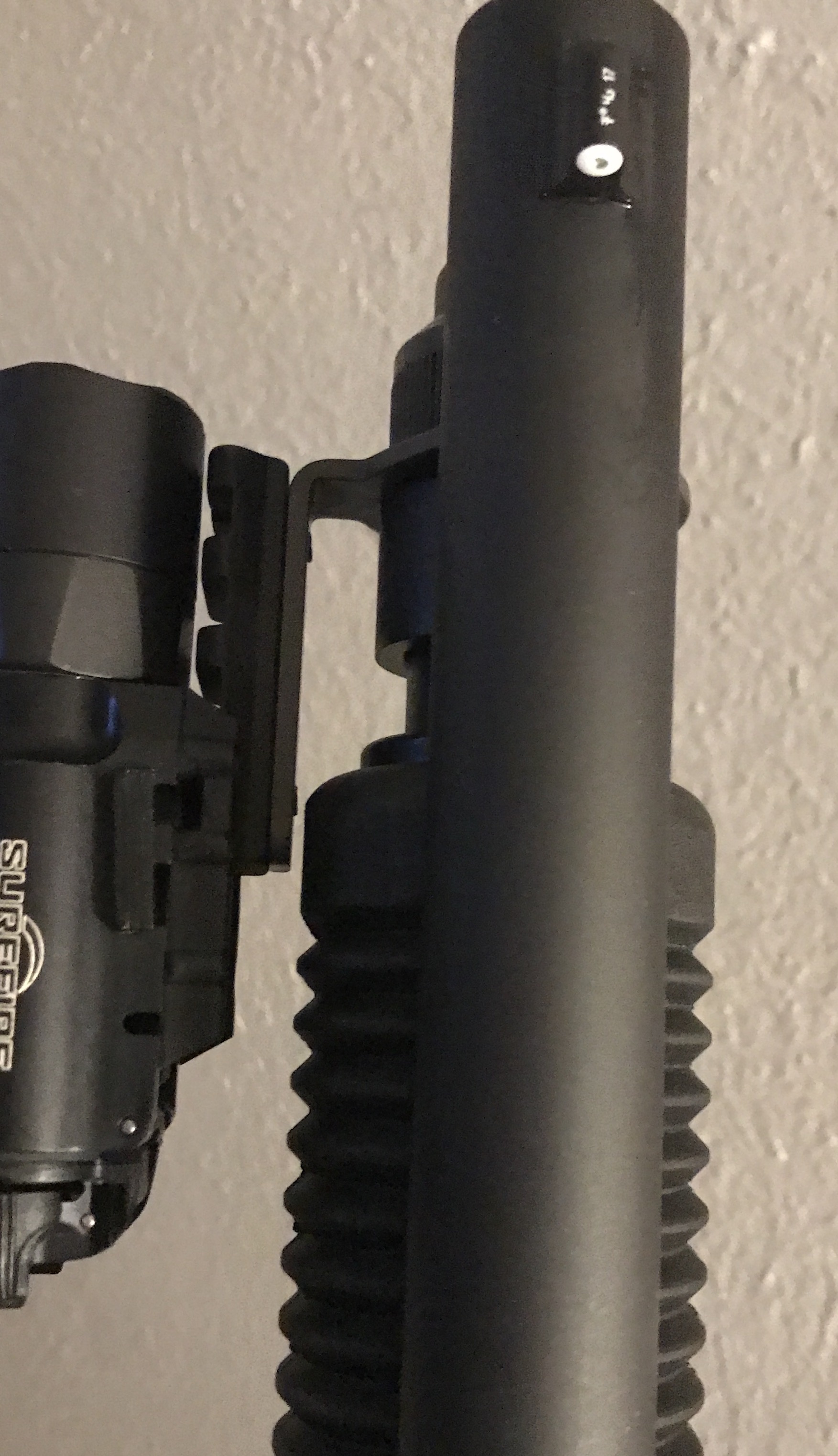 I put a Picatinny rail on the top of the Shockwave and then just mounted the TLR-2S to the rail. It's "upside down" but that only means you need to reverse the adjustments when sighting in the laser. Mine was close enough at 25 yards that I didn't bother making any adjustments.carlson1 wrote:What mount did you use for your light? I used a GG&G mount and I am not really happy about the position or the light.Soccerdad1995 wrote:I added a light / laser to mine and I just fire it from the hip. I'll try to get it to the range for some target pics but that likely won't be until Tuesday or Wednesday.