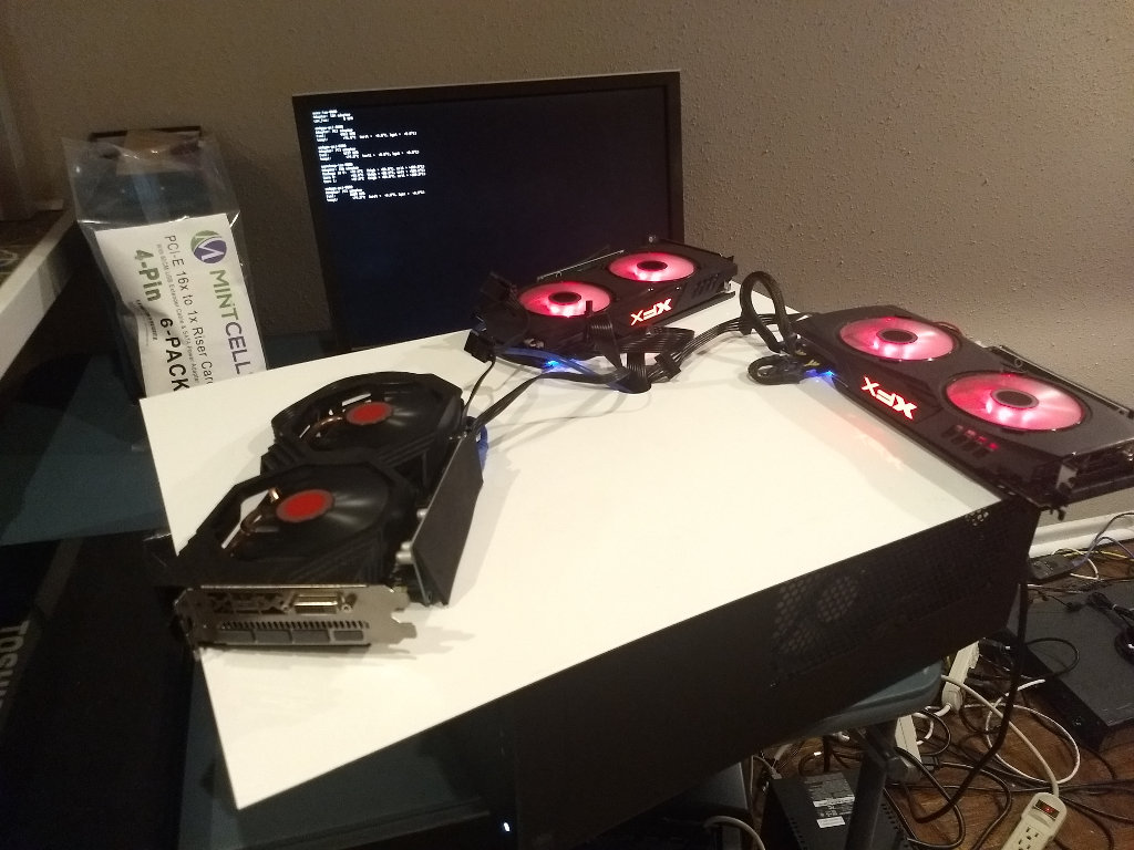 I know the thread is dying, but I wanted to post my mining rig. I need to build a frame, really.