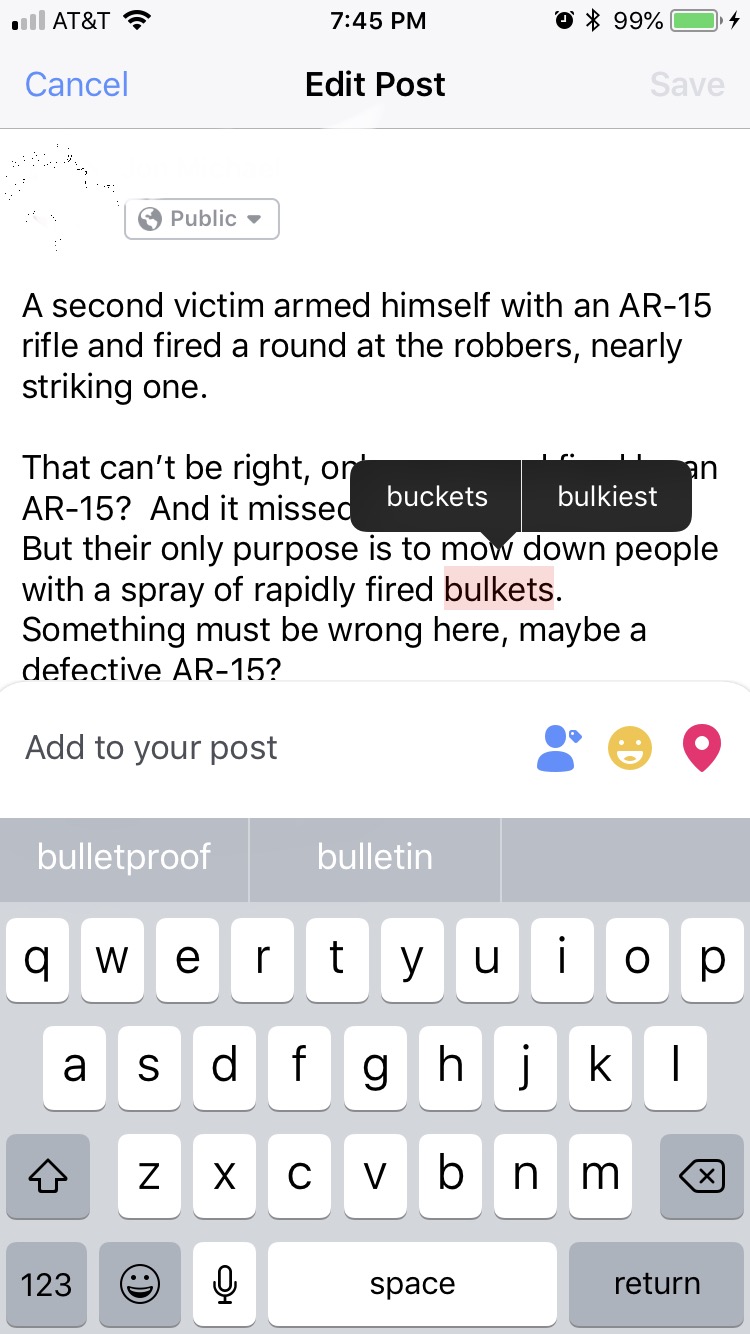 You can actually make it suggest the word ‘bullet’ or ‘bullets’ going forward. It’s not hard to do. The autocorrect has a learning function. For a while, every time I wanted to type the word ‘ammo’, autocorrect would want to capitalize the first letter. Eventually, by overriding the autocorrect, it learned that most of the time, I don’t want it capitalized, and it stopped suggesting it with a capital “A”. Yours will do the same thing with the word ‘bullet’, if you persist. Also, you can very easily put an override into your system through your keyboard preferences.