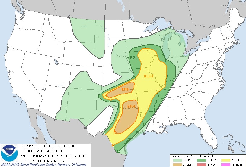 Tarrant County has already alerted storm spotters to be prepared for this evening into early tomorrow.kayt00 wrote: Wed Apr 17, 2019 11:22 am I guess the risk is still very high as I just got notification that Collin College is closing up shop at 1pm today and all afternoon and evening classes have been cancelled.