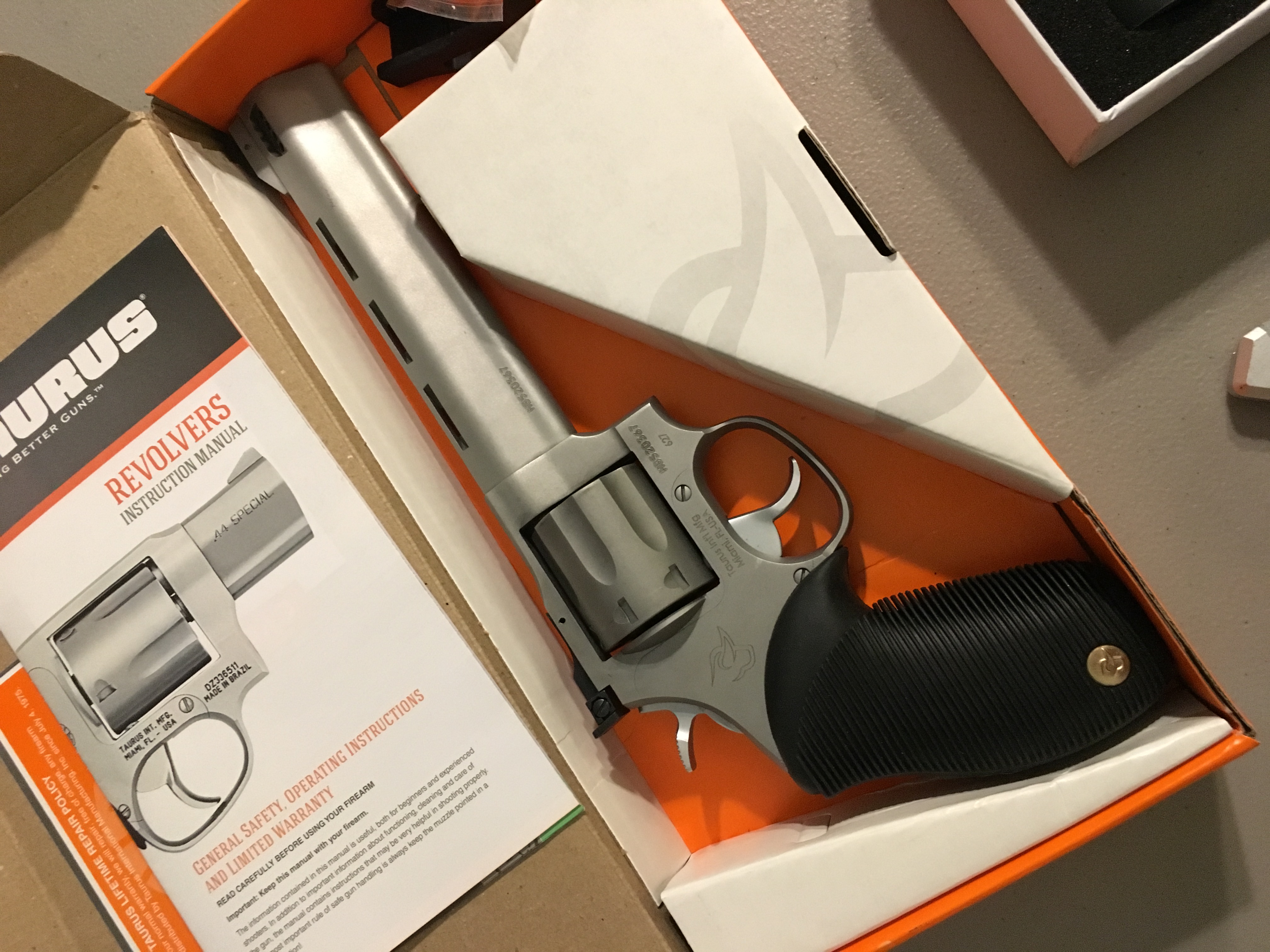 For sale or possible trade is a almost new Taurus 627 Tracker.. 6.5 inch stainless with built in barrel compesated ports and 7 round cylinder. Comes with Picatinny rail (Cost me $45.00) accessory and Red/Green dot sight (Very low end from Amazon, so don't get to excited). I also have everything that came with the gun... I've only had it for about 4 months and have less than 100 rounds of lower powered 38spcl through it... I bought it for my wife but she didnt like it... Between the price of the gun, FFL, shipping, scope mount and red dot I have almost $500.00 into this gun... I'm only asking $400.00, my loss is your gain.. So Please no lower offers.