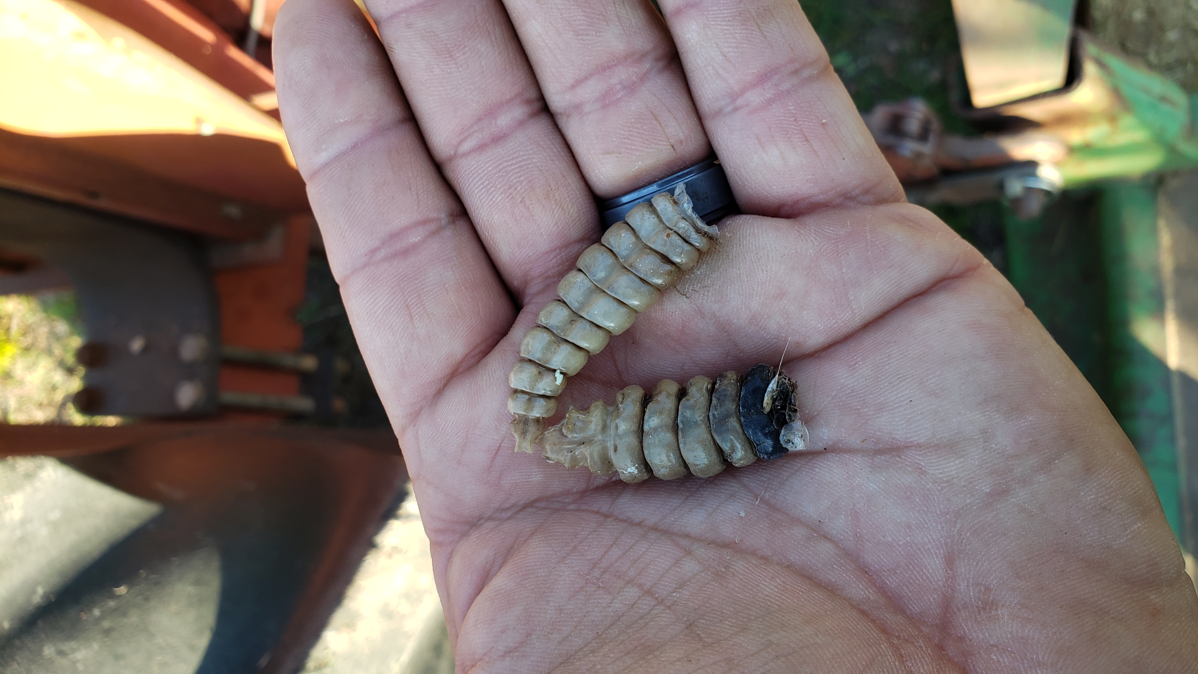 Father in law called an hour ago to help him dig a snake out of a wood pile in his barn. This was an aggressive little guy and about 2.5 Crocs long. Turns out that's the second snake he killed today. First one was between the duals of his rv. It was 3 Crocs long but didn't have as nice jewelry as the shorter one. That's 3 in his yard so far this year.