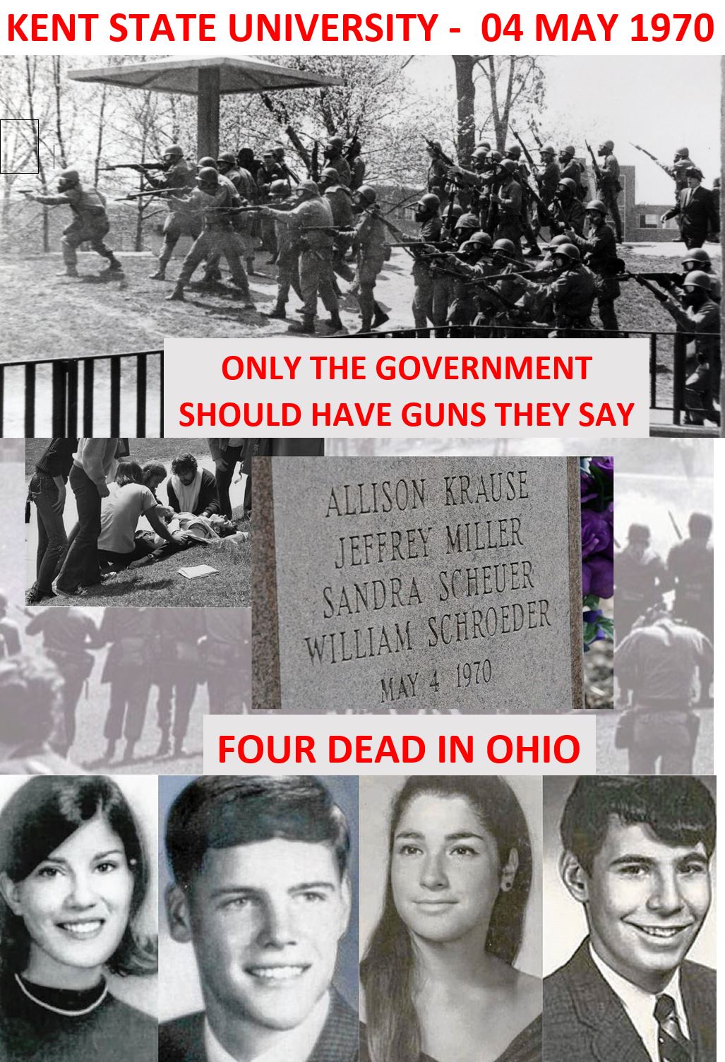 If anyone ever tells you "Only the government should have guns", ask them to describe what the government did with guns at Kent State University on May 4, 1970. Ask them if they'd be okay with history repeating itself. Ask them if they want to rewrite the Second Amendment would they also rewrite the First Amendment and remove Right of Assembly to petition the Goverment for a redress of grievances.