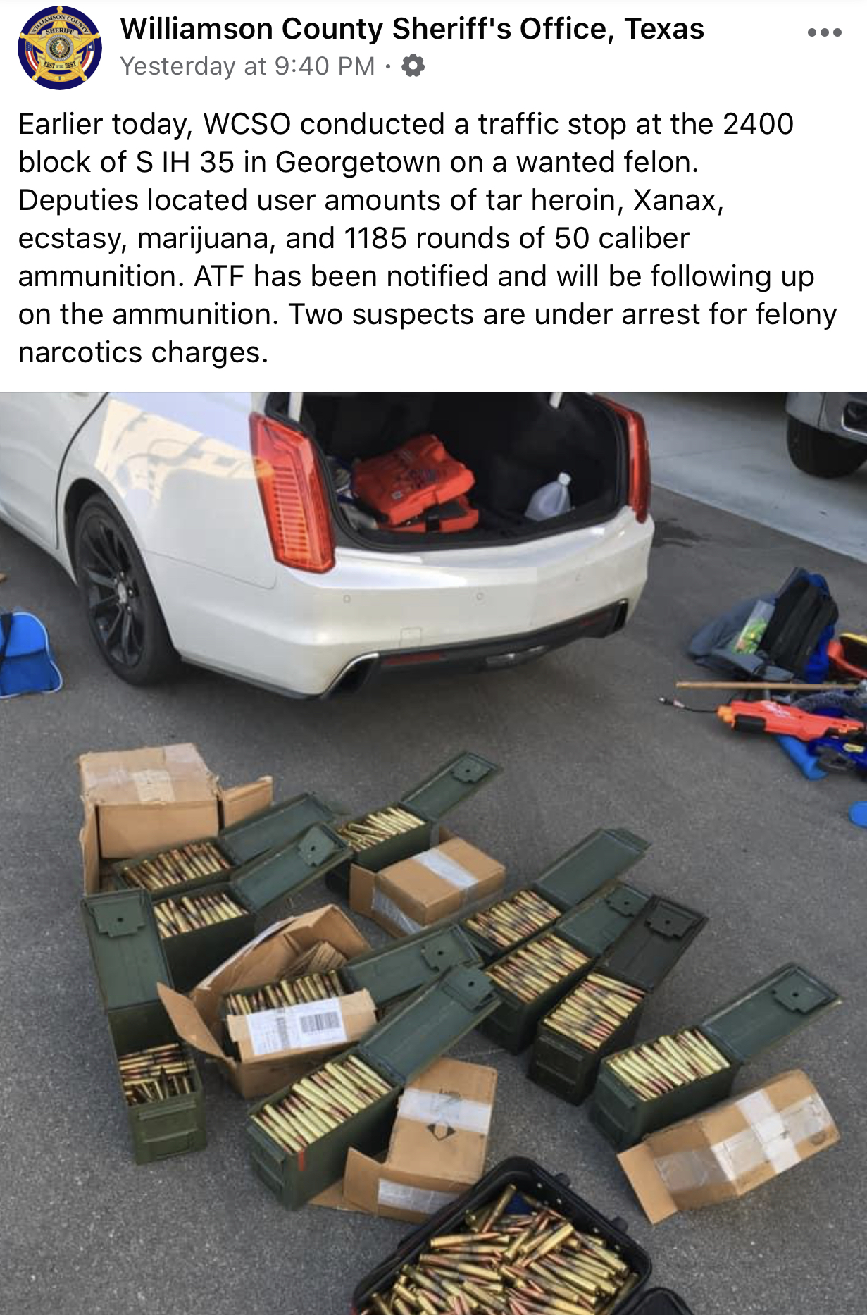I read the "1,185 rounds of ammunition" part and was about to give my usual eye-roll about "arsenals"... Then saw it was 1,185 rounds of .50 cal, and it ain't .50 AE. Still doesn't qualify as a jaw-dropper, but almost 1,200 rounds of .50 BMG ain't nuthin' to sneeze at. That would leave a mark.philip964 wrote: Thu Jul 09, 2020 8:06 pm https://www.kxan.com/news/local/william ... n-vehicle/
