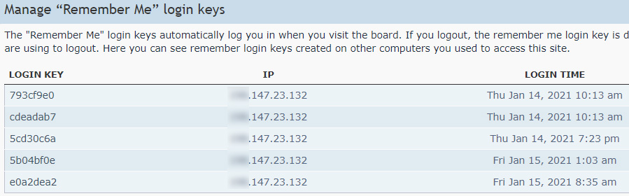Quick follow-up. Found the "Manage 'Remember Me' Login Keys" option on my user control panel. Yep; the board is definitely logging me out and every time I log back in it sets a new login key; I attached a screenshot showing the five unique keys set in two days, all for the same machine at the same IP address. I'll do some Googling and experimenting later today, but considering this is a plain-Jane Win 10 system with the latest (as in last Wednesday) updates and that I'm running the latest version of Chrome, I imagine I'm not the only one that may be seeing the...issue. It isn't a problem, but I'm just spoiled and used to being able to jump right on the board without logging in every time.