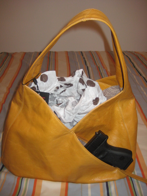 So finding a purse ccw is my best option for right now. I didn't really think that I was asking for much, but the pickings out there for my specific purpose were quite slim! I wasn't happy with the design of the purses made specifically for cc, so I had to go shopping for it. What made it harder was the fact that I couldn't just carry the Sig around with me at Macy's and try stuffing it into various purses to see if it would work. After weeks of searching, I finally found it!