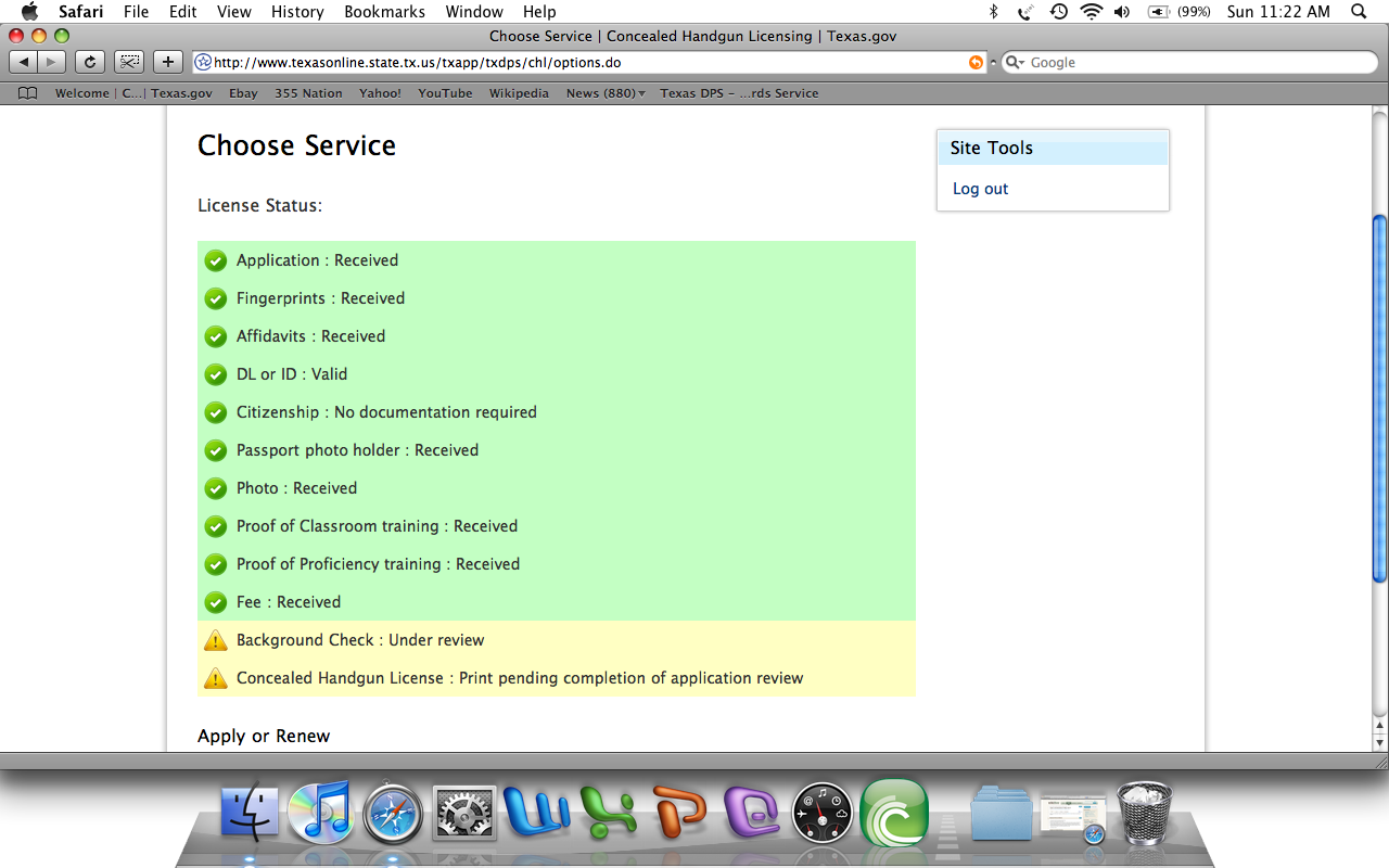 Has anyone tried to check their status yet this morning? The link is in a different place http://www.texasonline.state.tx.us/txapp/txdps/chl/" onclick="window.open(this.href);return false; and when I click "Login" under returning users, it only asks for DL #, SSN and DOB. When I enter that information, it takes me to a new screen that says Choose Service. The only link I can choose is to "Apply for your instructor certificate". Someone on another board said it gave him more information that the old system (ie, his is still in background check), but it gave me NO information at all. I guess it's because my status yesterday was "Packet mailed to applicant" and that means that although they have received my packet, they have done nothing with it yet??? I'd be interested in hearing if anyone else is getting the same non-information I'm getting...