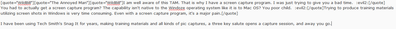 I have been using Tech Smith's Snag It for years, making training materials and all kinds of pic captures, a three key salute opens a capture session, and away you go.WildBill wrote:Trying to produce training materials utilizing screen shots in Windows is very time consuming. Even with a screen capture program, it's a major pain.The Annoyed Man wrote:You had to actually get a screen capture program? The capability isn't native to the Windoze operating system like it is to Mac OS? You poor child.WildBill wrote:I am well aware of this TAM. That is why I have a screen capture program. I was just trying to give you a bad time.