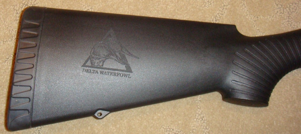 It has a small (3-4 inch?) Delta Waterfowl logo embossed on the stock (see pictures) and is in good shape. It does not come with the box but includes 3 chokes (IC, M, F) and the choke wrench. Two of the chokes have never been used.