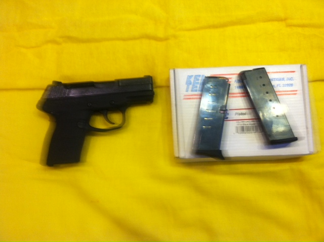 Kel Tec PF9 pistol with two magazines--one with finger grip, box and manual. I got this on trade and have other pocket pistols and a passel of 9 mm pistols, so it is looking for a home. Really clean gun, no scratches.