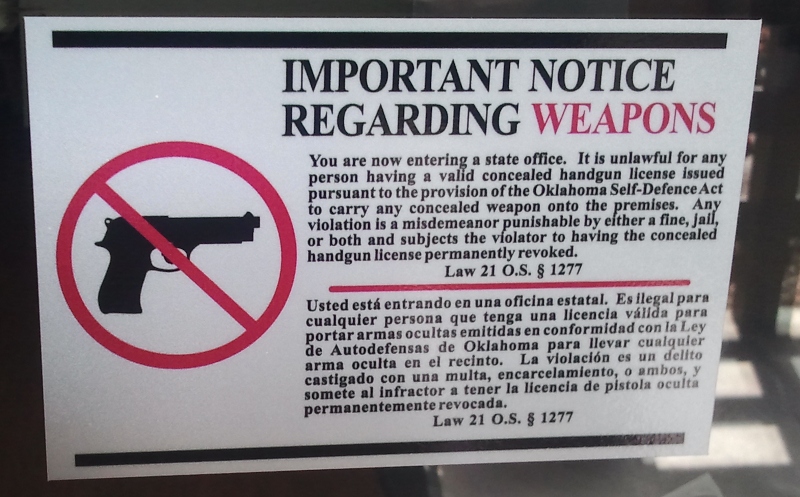The way I read it (again, my opinion, not legal advice), is that if your home state allows you to OC, you are allowed to OC in OK. This includes places like AK, where a permit to CC or OC is not required. IMO, TX CHL's CANNOT OC in OK.“No Firearm” signs in Oklahoma have no force of law unless they are posted on property that is specifically mentioned in State Law as being off limits to those with a Permit/License to Carry. If you are in a place not specifically mentioned in the law that is posted and they ask you to leave, you must leave. If you refuse to leave then you are breaking the law and can be charged. Even if the property is not posted and you are asked to leave you must leave. Always be aware of the possibility that responding Police Officers who may have been called without your knowledge and may not know the laws on trespass etc. could arrest you even if you are within the law.