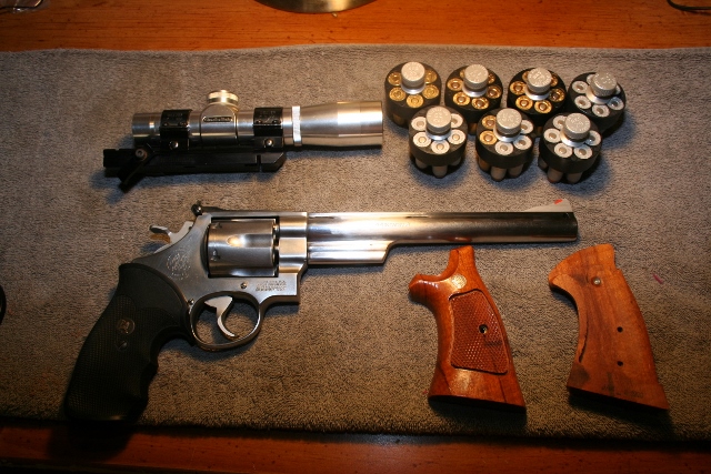 The first gun up is a S&W 44 Mag. Model 629-1. It has the 8 3/8 barrel. I have the original wood grips with date stamp of Jan. 1990. It also has a Charles Daly scope and 7 speed loaders. Asking price is $800.00 firm. To the best of my knowledge the pistol has less than 8oo rounds through it.
