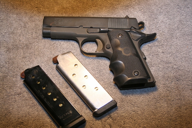 The second pistol is a Rock Island Armory 45 ACP. Model 1911A1 Compact. It is the 3 1/2 in. version. It has the bull barrel and skeleton hammer in it. I have 2 magazines for it and the original box, but not sure if I still have the test fire cartridge. I purchased it new and has less than 1000 rounds through it. It does havae a very small amount of holster wear on it. Asking price is $450.00 firm. Not looking for any trades as I am needing funds for Something else.