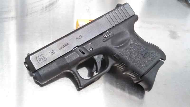 Glock 26 Gen 3 subcompact 9mm, 10+1 capacity. 4 magazines, 2 pierce +0 grip extensions. Speed loader. Smooth trigger. No box.