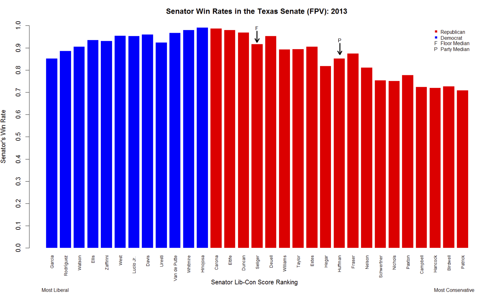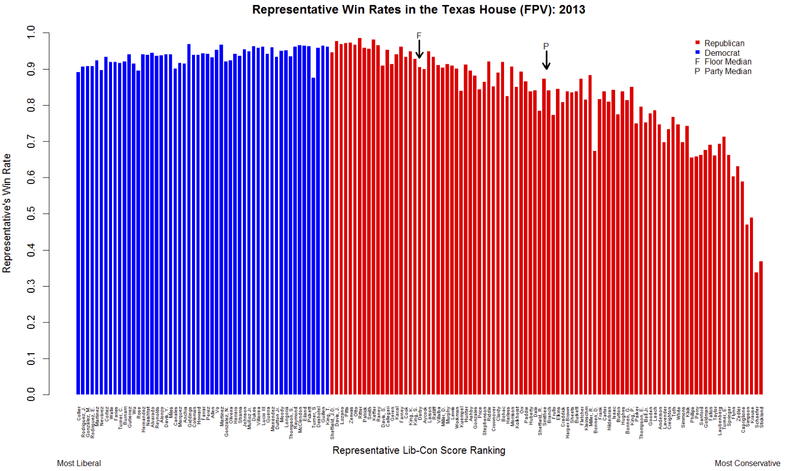 In the state Capitol's west wing, House Democrats brokered a tacit alliance with the GOP's moderate/centrist conservative bloc, led by Speaker Joe Straus, R-San Antonio. Liberal-Conservative Scores were calculated for legislators using their regular session roll call vote behavior (final 2013 House and Senate ideological scores and rankings will be published following the end of this summer's special session or sessions). These scores indicate that virtually all of the most prominent Republicans on the speaker's leadership team either were located in the GOP's moderate conservative wing (i.e., representatives with Lib-Con Scores significantly less conservative than those of more than one-half of their Republican colleagues) or, and less commonly, in its centrist conservative wing (i.e., representatives with Lib-Con Scores neither significantly more conservative or less conservative than over one-half of their fellow Republicans).