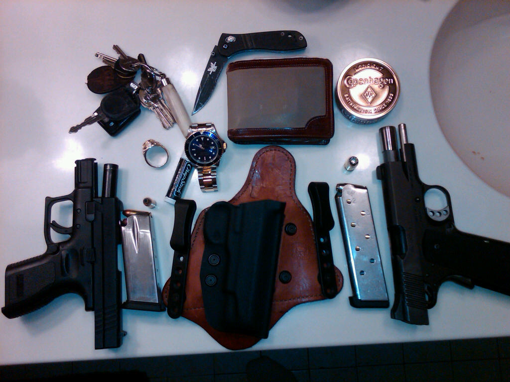 Its not really that much. Keys, chapstick, benchmade in front left pocket. Phone is int eh front right pocket. Can of snuff in back left. Wallet in the back right. Pistol at 3:00 or so on right hip.