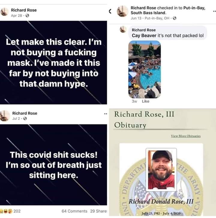 37 yo veteran tests positive for Covid after making statements on social media about not wearing a mask, then showing him partying at a pool with a large group of people, then posting after his positive test that Covid is bad and having trouble breathing, finally his obituary is shown.