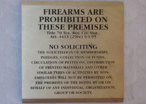 I then carefully explained that any such signage was discrimination against law abiding citizens, and a couple of other things, asked her to please have corporate respond rather than some low level flack, and ended by paraphrasing my friend Brian Burns "Welcome to Texas, now won't you please go back home" and hung up in disgust.