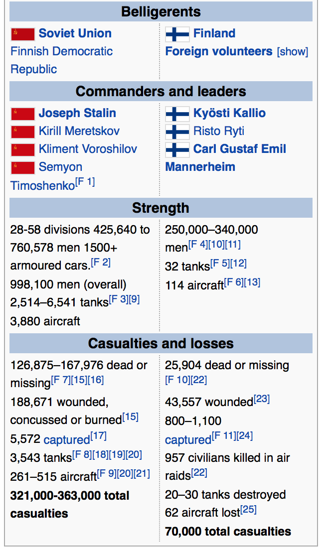 When an insurgency wins, it has to do with it having the support of the larger part of the populace in which it takes place. Otherwise, military might will eventually prevail. That's why Vietnam turned out the way it did. That's why Estonia will likely do well in the event of a Russian invasion. I'm reminded of the Winter War, when the soviets invaded Finland in 1939 - an invasion that lasted all of 3 months, 1 week and 5 days, during which sniper Simo Häyhä reaped 505 soviet souls for the cause. The attachment below shows soviet stats in the left column, and Finnish stats in the right column. The soviets had to withdraw.