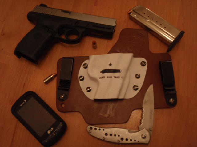 This is my Smith & Wesson sw9ve, MaxTuck, Kershaw knife, about 17 Horniday Critical Duty 135gr.+p, and don't forget the cell phone.