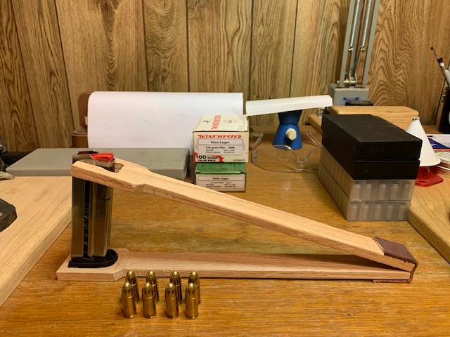 Following the keep-it-simple principle - it's made of two boards hinged at the end. One board is routed to accept the mag baseplate, and the other is notched to fit the follower tabs.