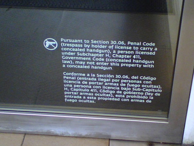 ClarkLZeuss wrote:The way I understand it, just going through a different entrance does not put you in the clear. Imagine the following courtroom scenario:Tahoe132 wrote:Anyways, when I returned to the building, I went through another entrance which did not have the 30.06 sign posted. So is this legal to carry inside??