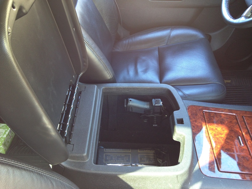 I like the console vault, but on the cheap I just took my extra fobus holster and secured it with screws to the inside of the console. Not only allows me to store my Glock 23 in a handy place while traveling, but also gives me a short term storage location. I also have a lock box under the back seat, but not too handy to get to in a crisis.