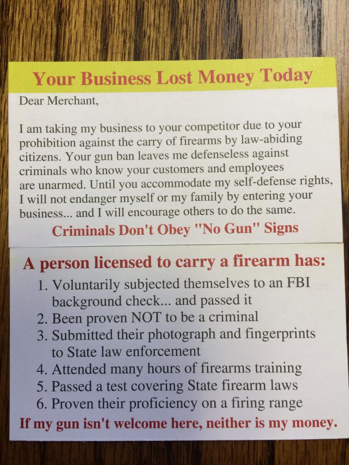 I found this card online. I suggest that all of us, Pro2A men and women, make a concerted effort to print letters like this and start putting them in the suggestion boxes, handing them to managers and/or mailing them to every business with 30.06 signs.
