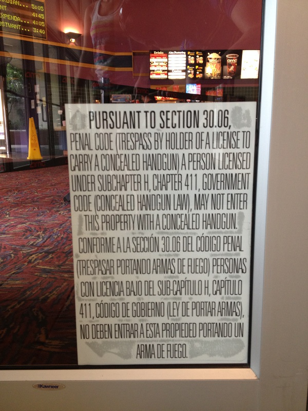 The AMC theater in Southwest Austin used to have two non-compliant (text too small) 30.06 signs posted inconspicuously in the lower corners of the two main entrances.