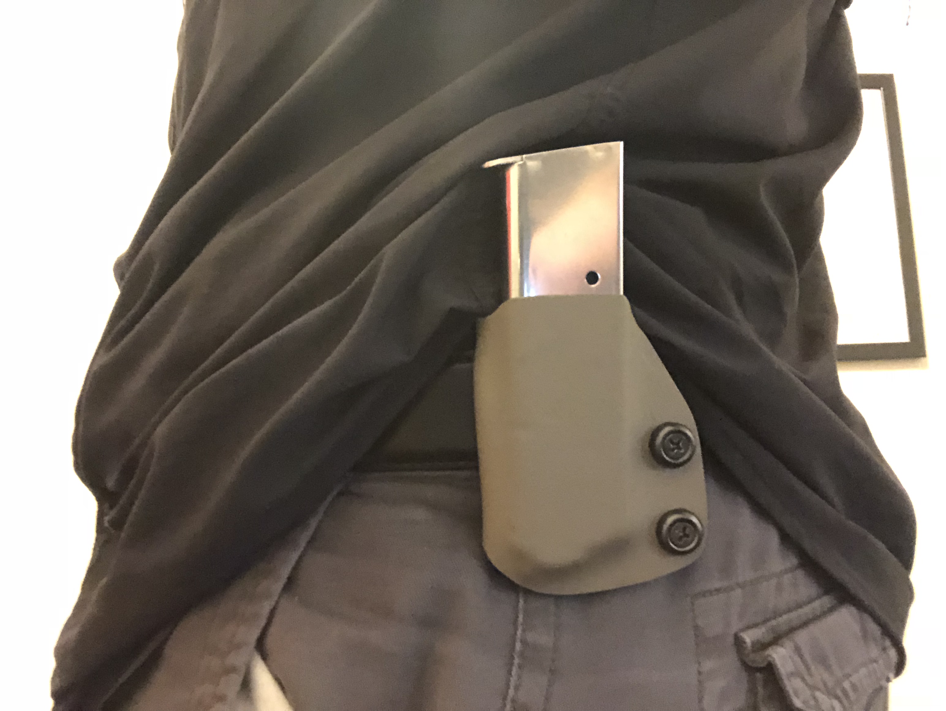 Been wanting a 1911 mag pouch that’s easy on and off. It’s not very pretty but it’s got very good retention and works. The belt clip slides over the belt and hooks on the bottom. So it slides between the inside of the belt and the outside of the pants. Very secure and stays put. Doesn’t come off when mag is drawn. I made the mouth of the carrier wide so it’s very easy to funnel the mag down into the pouch just like a flared mag well works on a pistol. I put a bullet in the mag when I formed it so that it is not being pushed on or squeezed while in the holster. Not to mention if you form without a round in the mag then when you load it and stick it in the holster it will not work correctly. It works with an empty mag as well so when I’m at the range I can change mags and not have to set one down. I don’t like iwb mag carriers but I do like the ease of how they come in and out so I reveresed it I guess you’d say. My holster is black and so is my belt but my shirt will be covering this so it doesn’t matter. Thought I’d share.
