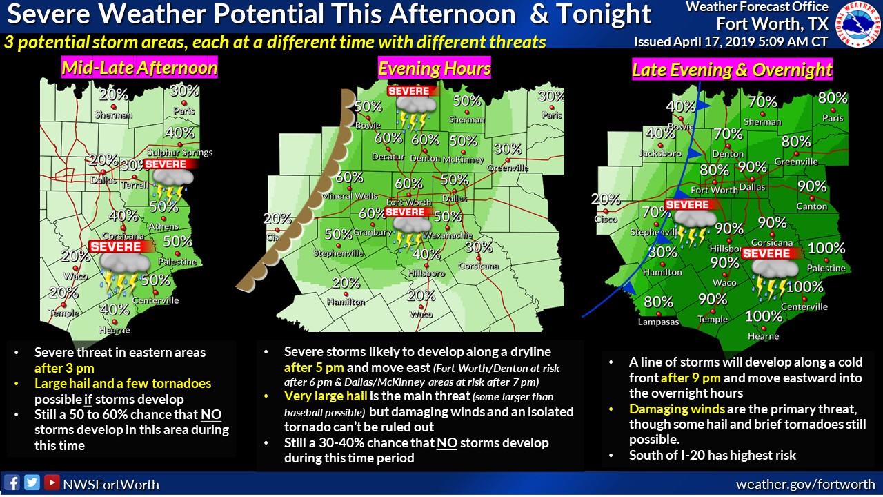 Eastern areas (east of Bonham, Corsicana, Hearne line) after 3 pm will be the first region of concern. This area looks like it has the highest potential for significant tornado activity, but it’s also the region where we are the least confident severe storms will be able to develop. Any storms that do develop in this area during the mid-late afternoon hours will have the potential to produce very large hail (baseball size) and damaging winds as well.