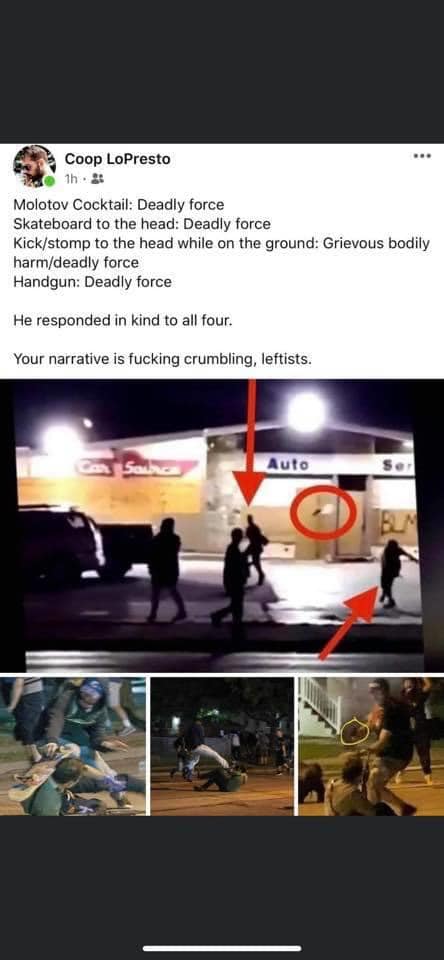 HereLaneman wrote: Fri Aug 28, 2020 4:19 am There's probably an active thread on this but I could not find it. Just wondering what you all think about Kyle the 17 year old who shot three protesters in Kenosha Wisconsin. I watched the full video carefully and it appears to be self defense for the last 2 people he shot. The first person shot earlier in the car lot does not have clear video of the incident. Wondering if he was legally able to carry a long gun at 17. He's in trouble either way, it is a solid blue state. Even if the shootings were legal, he is likely facing a jury of liberals who will decide his fate.